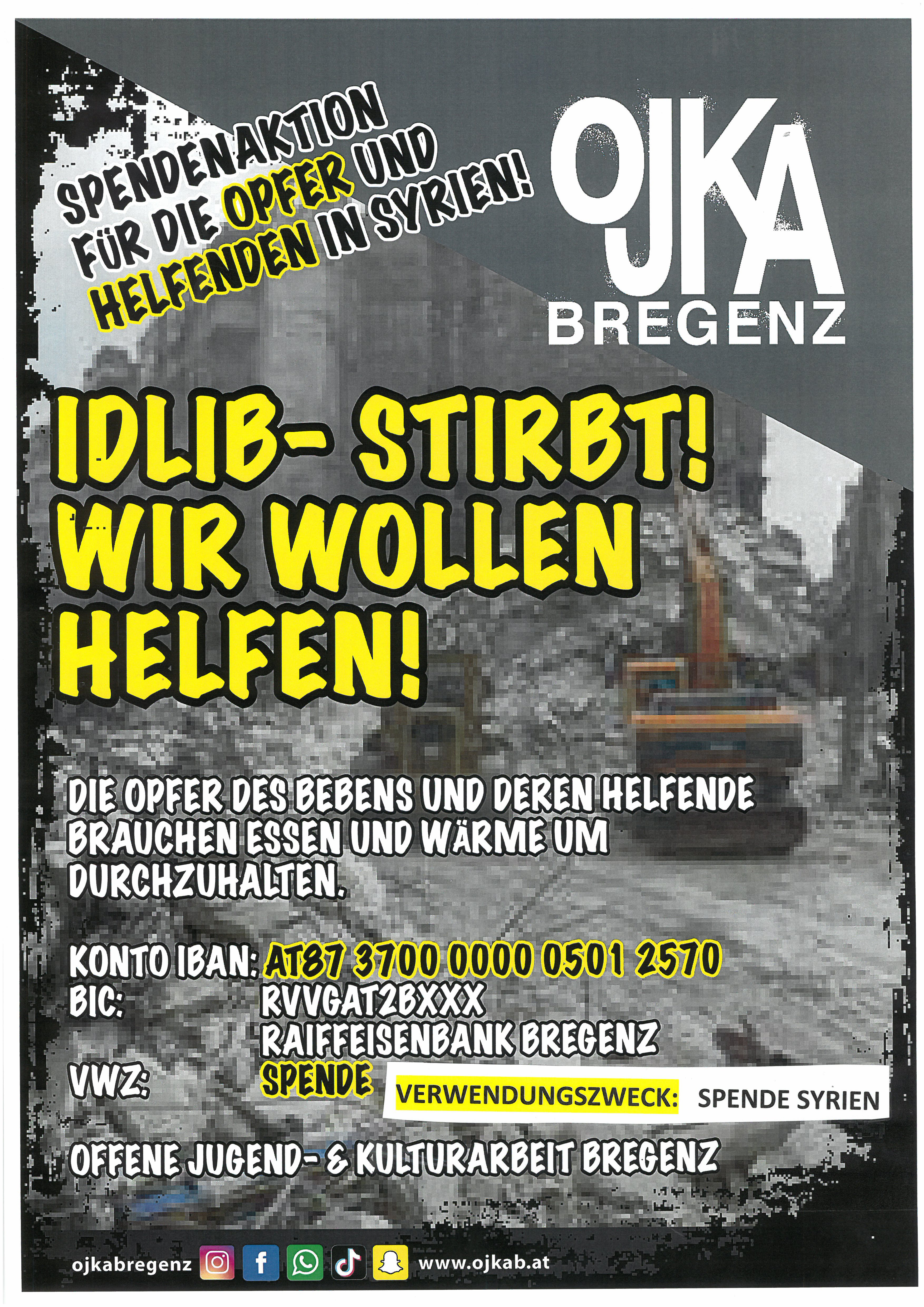 Die Offene Jugend- und Kulturarbeit Bregenz bittet um finanzielle Unterstützung für Syrien.