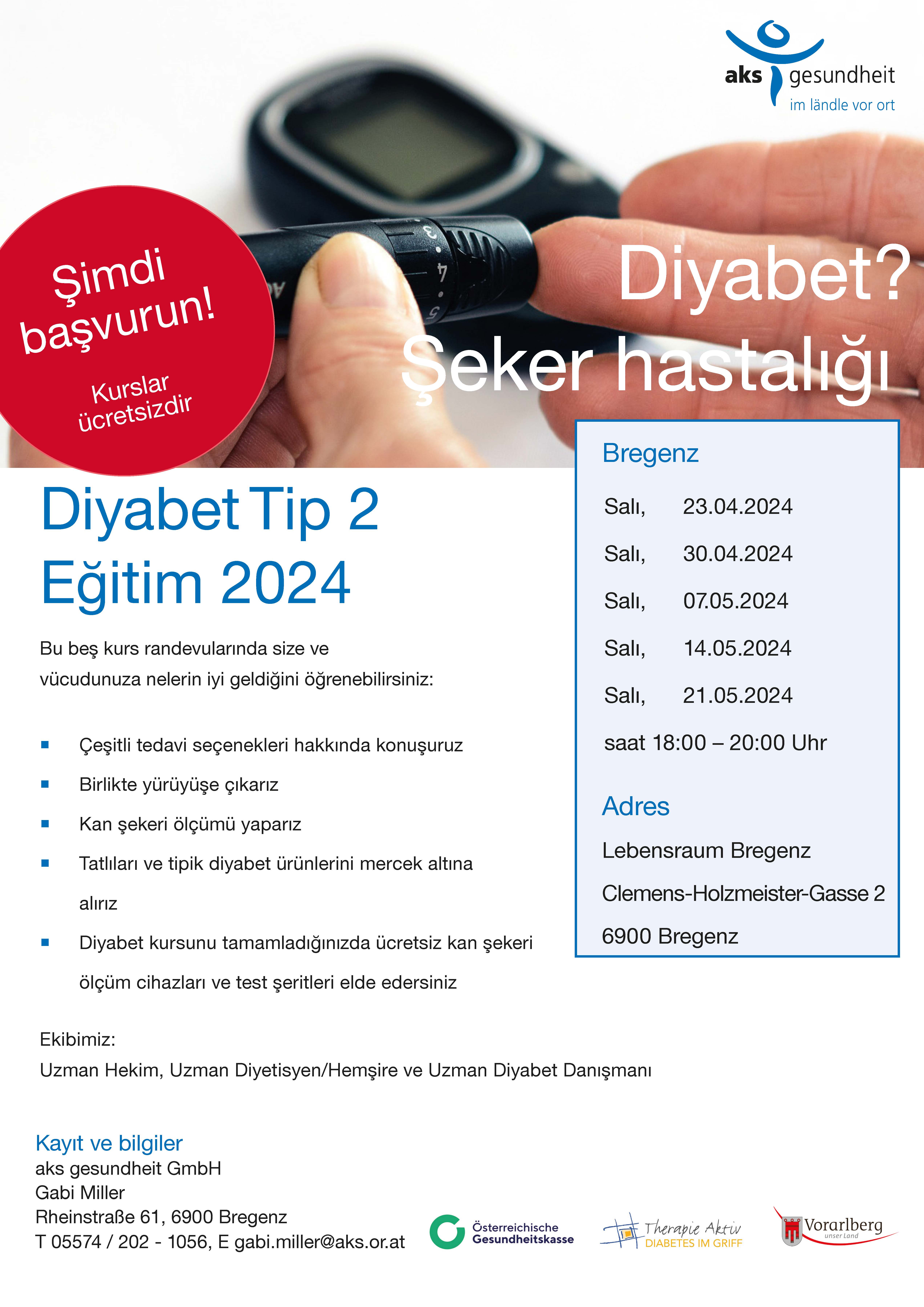 Interessierte Diabetespatientinnen und Diabetespatienten Typ 2 können sich direkt bei der aks unter T: 055 74 / 202 – 1056 oder gesundheitsbildung@aks.or.at zur Schulung anmelden.