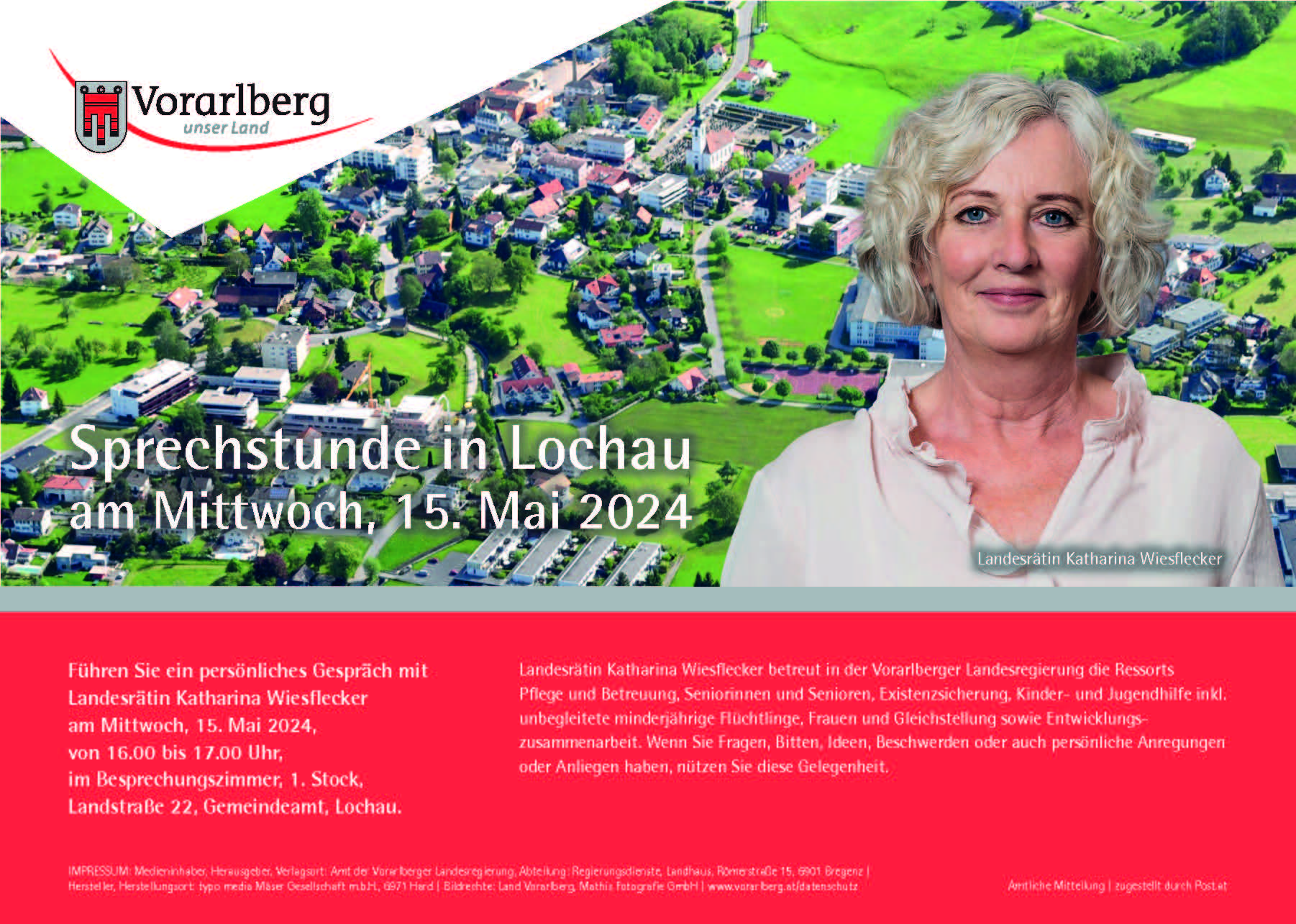 Führen Sie ein persönliches Gespräch mit Landesrätin Katharina Wiesflecker am Mittwoch, 15. Mai 2024, von 16.00 bis 17.00 Uhr, im Besprechungszimmer, 1. Stock, Landstraße 22, Gemeindeamt, Lochau.