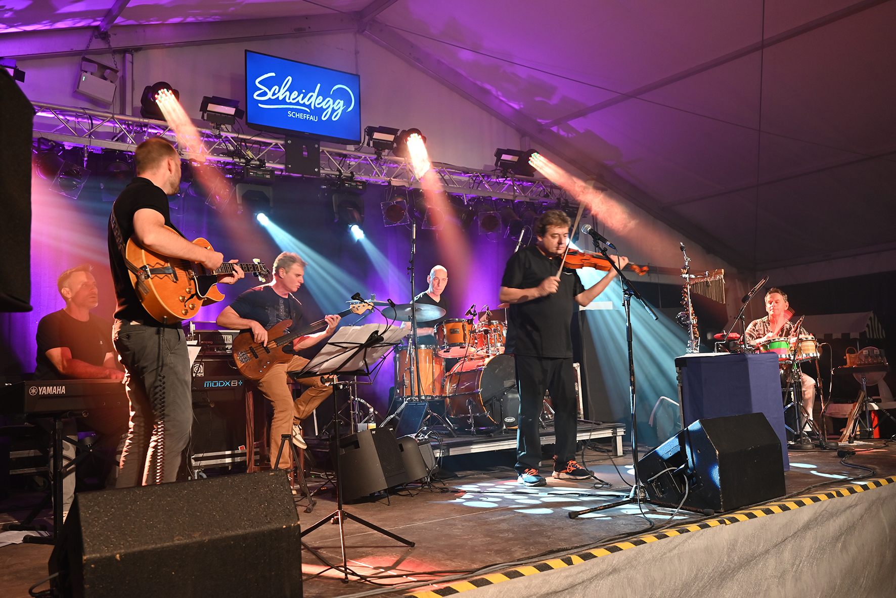 Die hochkarätige Besetzung mit Jazzgeiger Rudi Berger, Bassist Oswaldo Amorim, Markus Gaudriot (Piano, Keyboads), Drummer Davide Giovannini sowie Pepi Kramer (Percussion) überzeugten mit einem Feuerwerk der Traditionen von Jazz bis hin zu Rudi Bergers Weltmusik gewürzt mit brasilianischen Einflüssen. Nach diesem Konzert legte DJ Brian Moosbrugger noch bis Mitternacht fetzige Tanzmusik im Partyzelt auf.