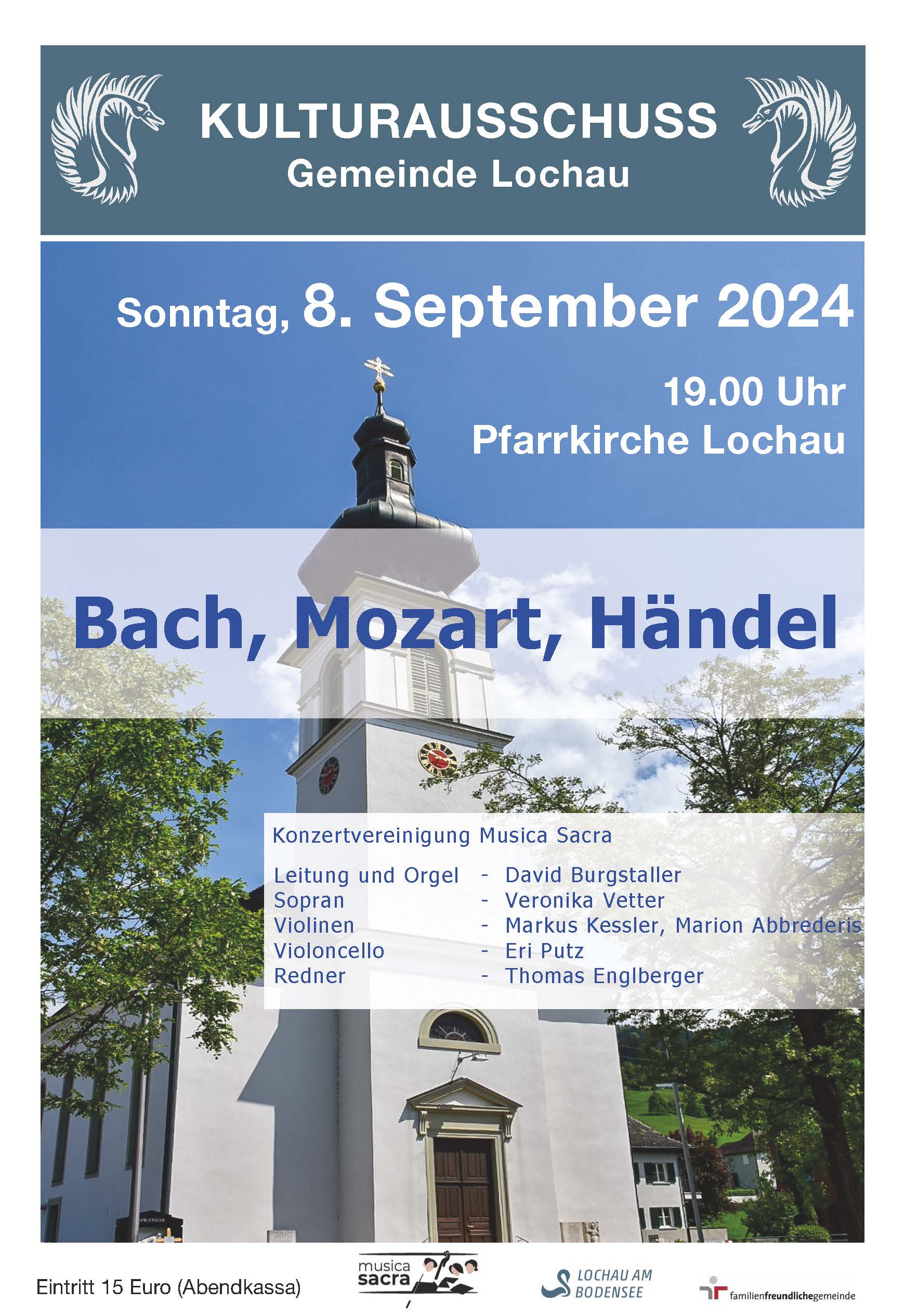 Der Kulturausschuss der Gemeinde Lochau unter Obfrau Petra Rührnschopf lädt zum Konzert mit dem Kammermusikensemble der Konzertvereinigung Musica Sacra in die Pfarrkirche Lochau am Sonntag, 8. September um 19 Uhr ein.