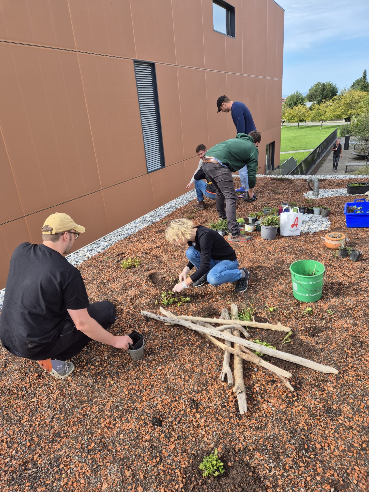 Die Vorarbeiten für das Flachdach vor dem Gemeindeamt übernahm die Firma PP Kutzer aus Dornbirn. Abdichtung, Dränage und Wasserspeicherelemente wurden fachgerecht vorbereitet, sodass die Teilnehmenden anschließend selbst aktiv werden konnten. Mit zahlreichen Pflanzenspenden wurde das Dach begrünt und zu einer kleinen grünen Oase gestaltet.