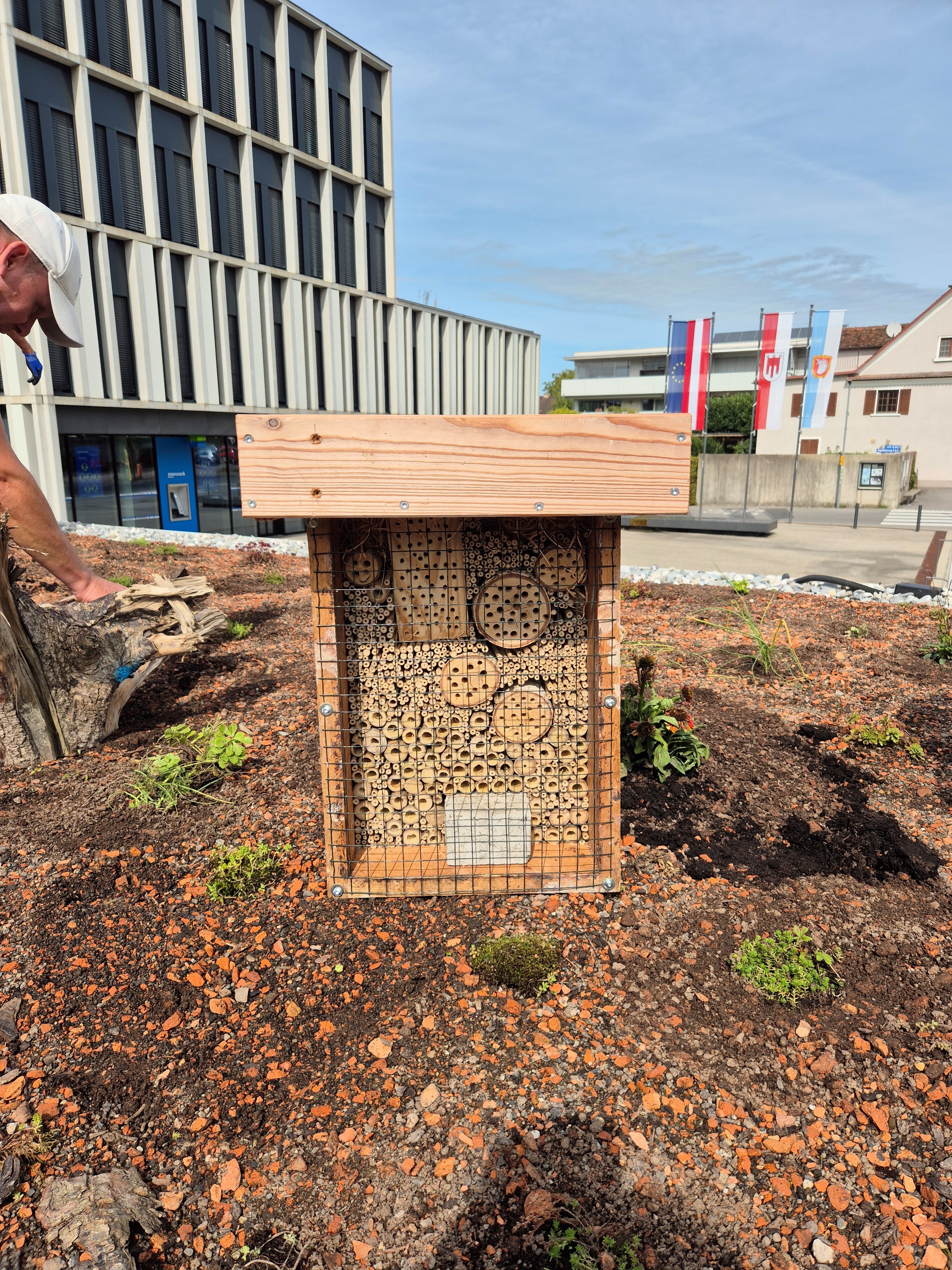 Besonders praxisnah war der Bau von zwei Insektenhotels, der von Melitta Sohm, Obfrau des Obst- und Gartenbauvereins Leiblachtal, fachkundig angeleitet wurde. Auch dekorative Treibholzelemente fanden ihren Platz auf dem Dach und bieten nun zusätzlichen Lebensraum für Insekten.