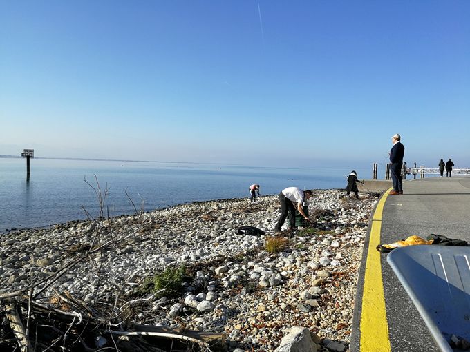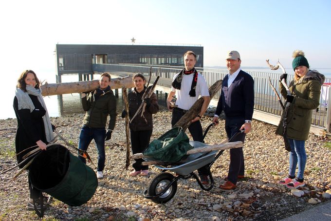 So organisierte das Lochauer Seehotel noch kurz vor dem Wintereinbruch diese Aufräumaktion am „hauseigenen“ Kaiserstrand, und 14 Mitarbeiter aus verschiedenen Abteilungen wie Direktion, Sekretariat, Bankett, Sales & Marketing, Küche, Buchhaltung und Service sowie zwei Lehrlinge waren hier gerne dabei. Mit Schubkarre, Kübeln, Abfallsäcken und Arbeitshandschuhen bestens ausgerüstet, wurde haufenweise Treibholz eingesammelt, dazu kam jede Menge Restmüll.