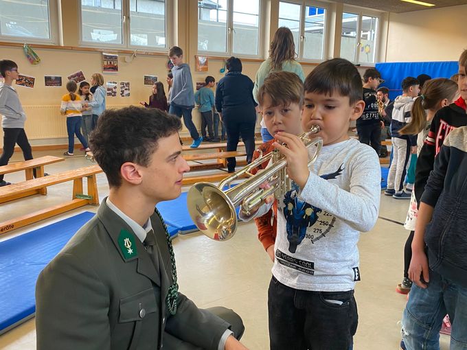 Hier begeisterten acht Musikanten der Militärmusik Vorarlberg unter der professionellen Leitung von Vizeleutnant Musikmeister Gerald Wolf rund 180 Schüler und Lehrer gleichermaßen mit einer sehr unterhaltsamen und kindgerechten Vorstellung verschiedener Holz- und Blechblasinstrumente. Alle Kinder durften dann ihre Lieblingsinstrumente wie Trompete, Tenorhorn, Klarinette, Posaune, Saxophon, Horn oder Tuba natürlich selbst ausprobieren und ihr Talent als künftige „Jungmusikanten“ unter Beweis stellen.