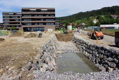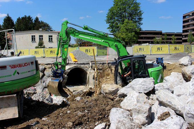 Nach der Anlegung einer Baustraße startete man im unteren Teilbereich mit den Aushubarbeiten für ein neues, rund 30 Meter langes Bachbett, von der bestehenden, nach rechts abzweigenden Verrohrung bis hinunter zum künftigen Einlaufwerk. Von hier soll dann der Bach in direkter Linie durch die neuen Bachdurchlässe im Bereich L 190, ÖBB-Trasse und Bodenseeradwanderweg ebenfalls „naturnah“ in den Bodensee geführt werden. Das neue Gerinne hat eine Sohlbreite von fünf Metern und ist mit einer Steinriegelmauer eingefasst.