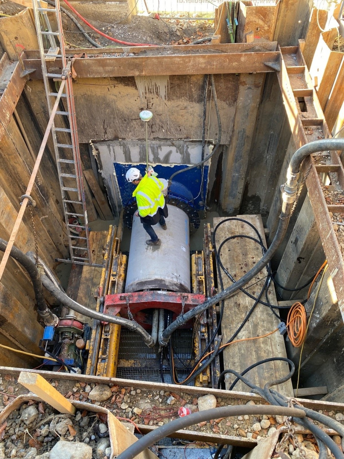 Microtunneling ist ein spezielles Verfahren für den grabenlosen Rohrvortrieb bei Neuverlegung in einer neuen Trasse. Dabei können Rohrleitungen im Durchmesserbereich von DN 250mm bis DN 1800mm unterirdisch und ferngesteuert verlegt werden. Von einem Startschacht (Pressgrube) wurde so beim Wellenaugraben eine Verrohrung (Stahlbetonrohr DN 1000mm) mittels eines Vortriebsgerätes mit Presse und Bohrkopf vorgetrieben.