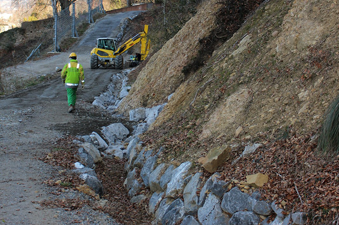 So wurden von Oktober 2016 bis November 2018 entlang einer neu angelegten Forststraße Steinschlagschutzdämme und Steinschlagschutznetze errichtet. Im Zuge der Verbauungsmaßnahmen galt es auch, die Schutzwirkung der überalten Baumbestände durch Holznutzungen und Wiederaufforstungen zu verbessern. Und schon während der Errichtung der Forststraße wurden bergseitige Entwässerungsgräben angelegt und „der neue Wellenaugraben“ entsprechend ausgebaut.