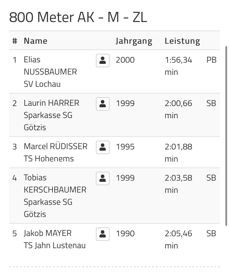 Bei den Landesmeisterschaften der Leichtathleten auf der Dornbirner Birkenwiese setzte Mittelstreckenläufer Elias Nussbaumer am Pfingstmontag seinen Erfolgslauf fort. Der 21-jährige Lochauer gewann die 800 Meter in 1:56.34 Minuten und verbesserte damit seine - erst vor kurzem in Bregenz aufgestellte - persönliche Bestleistung um 0,8 Sekunden. Der junge Leichtathlet hat somit beide Meistertitel in der Mittelstrecke 2021 gewonnen.
