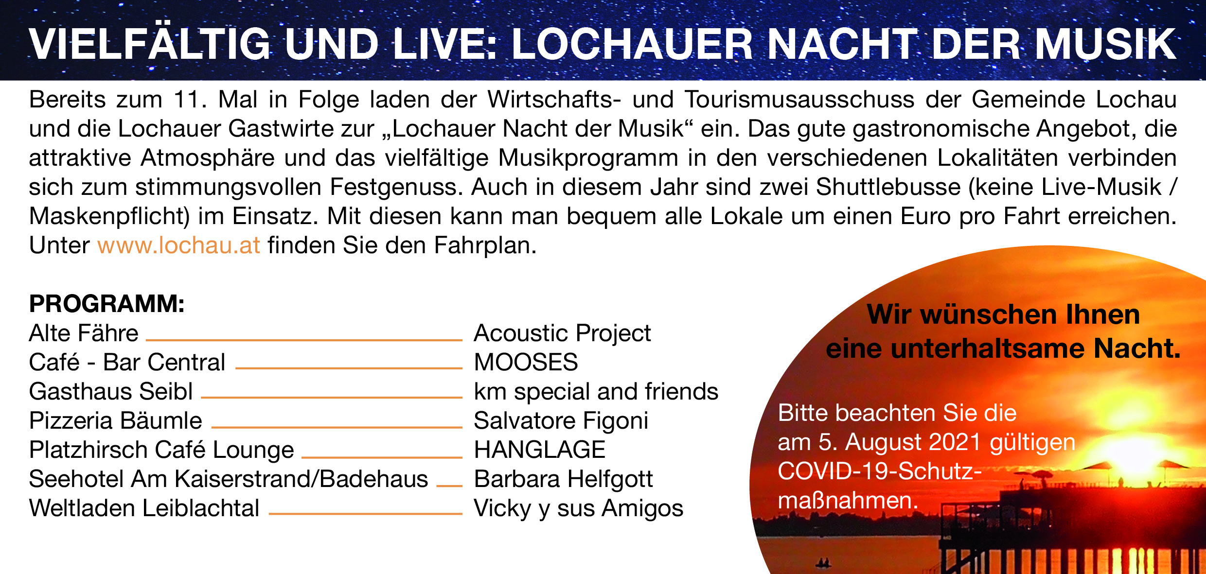 Bereits zum 11. Mal in Folge laden der Wirtschafts- und Tourismusausschuss der Gemeinde Lochau und die Lochauer Gastwirte zur „Lochauer Nacht der Musik“ ein.