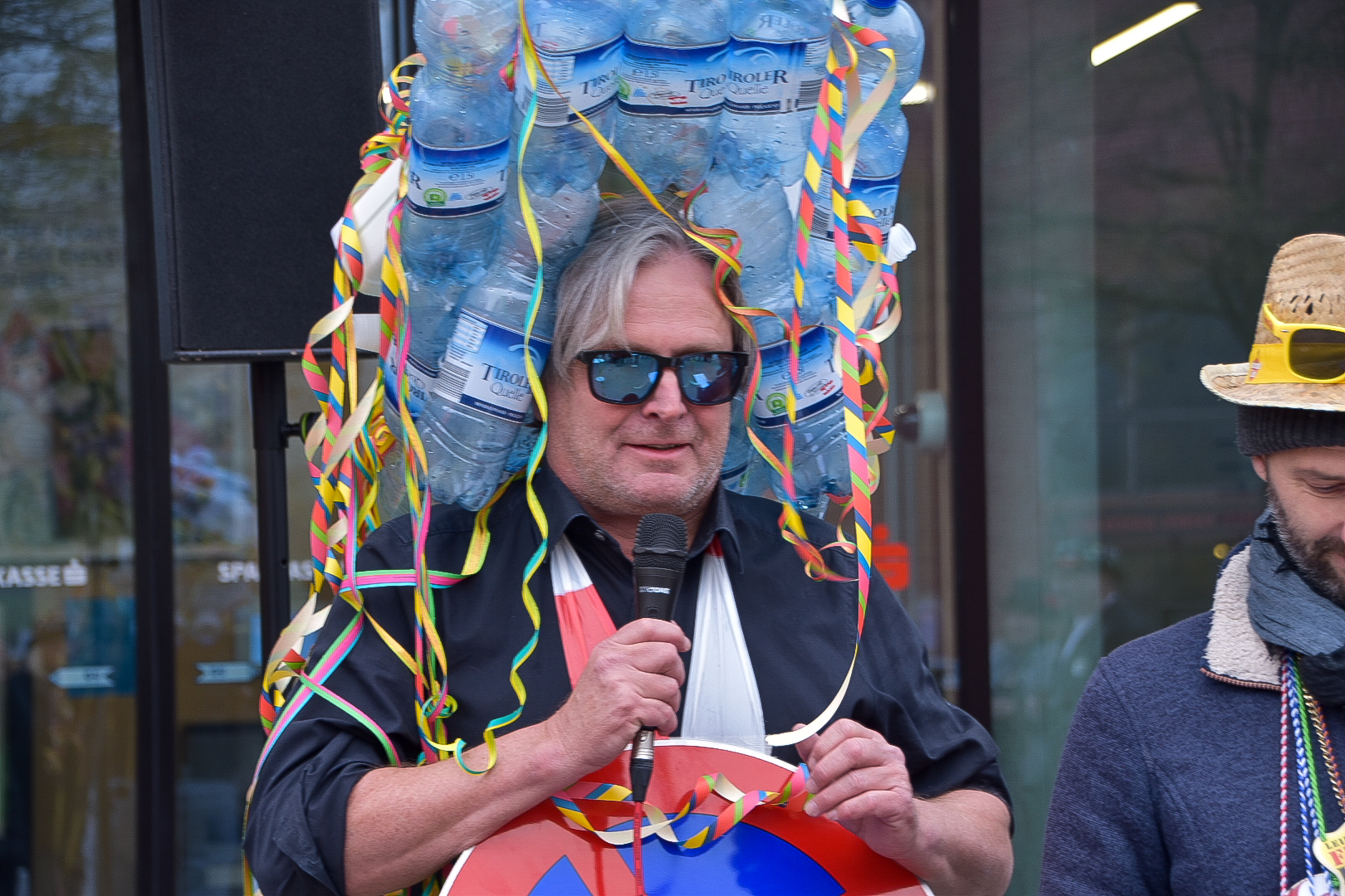 Frank Matt, mit zahlreichen Plastikflaschen auf dem Haupt, erklärte mit einem Grinsen und Bezug nehmend auf die vor wenigen Wochen geänderte Parkplatzsituation bei der Schule: „Die Aufforderung via Facebook, man solle mir so lange mit PET-Flaschen auf den Kopf schlagen, bis ich wieder vernünftig werde, fand ich einfach so genial lustig, dass ich mir das einfach nicht verkneifen konnte. Im Faschingstreiben bin selbst ich nicht vernünftig, dieser Spaß musste einfach sein!“