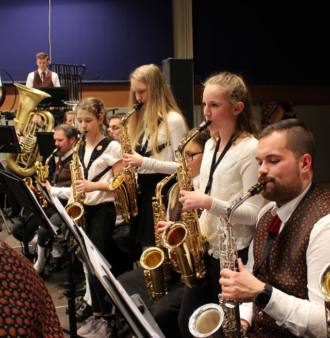 Auf der Konzertbühne präsentieren stolze 50 Musikanten und Musikantinnen unter der Leitung des Kapellmeisters Harald Schele ein sehr interessantes und unterhaltsames Programm mit anspruchsvoller Blasmusik auf hohem Niveau.