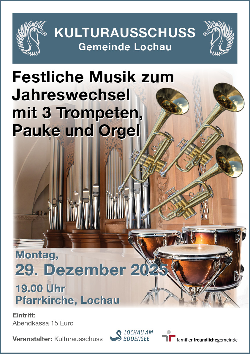 Das Nördlinger Bachtrompeten Ensemble gastiert am 29. Dezember 2025 um 19 Uhr mit einem erlesenen Programm aus Werken von J. S. Bach, G. F. Händel, E. Humperdinck und Tom Lier sowie ausgewählten Werken zur Weihnachtszeit, speziell eingerichtet für drei Trompeten und Orgel, in der Kirche in Lochau.