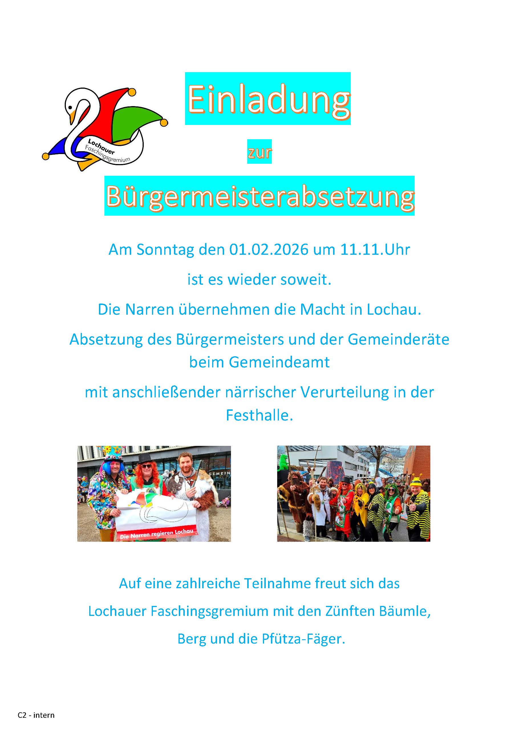 - Gemeindeamt/FesthalleDie Narren übernehmen die Macht in Lochau! Absetzung des Bürgermeisters und der Gemeinderäte beim Gemeindeamt mit anschließender Verurteilung in der Festhalle.