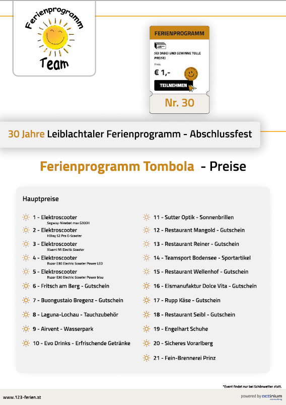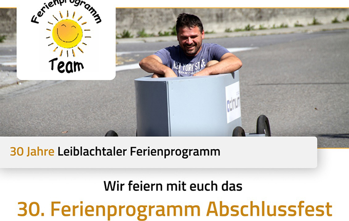 - Dorfplatz HörbranzDas verschoben Abschlussfest des Leiblachtaler Ferienprogramms findet nunmehr am 8. Oktober 2022 am Dorfplatz in Hörbranz statt,