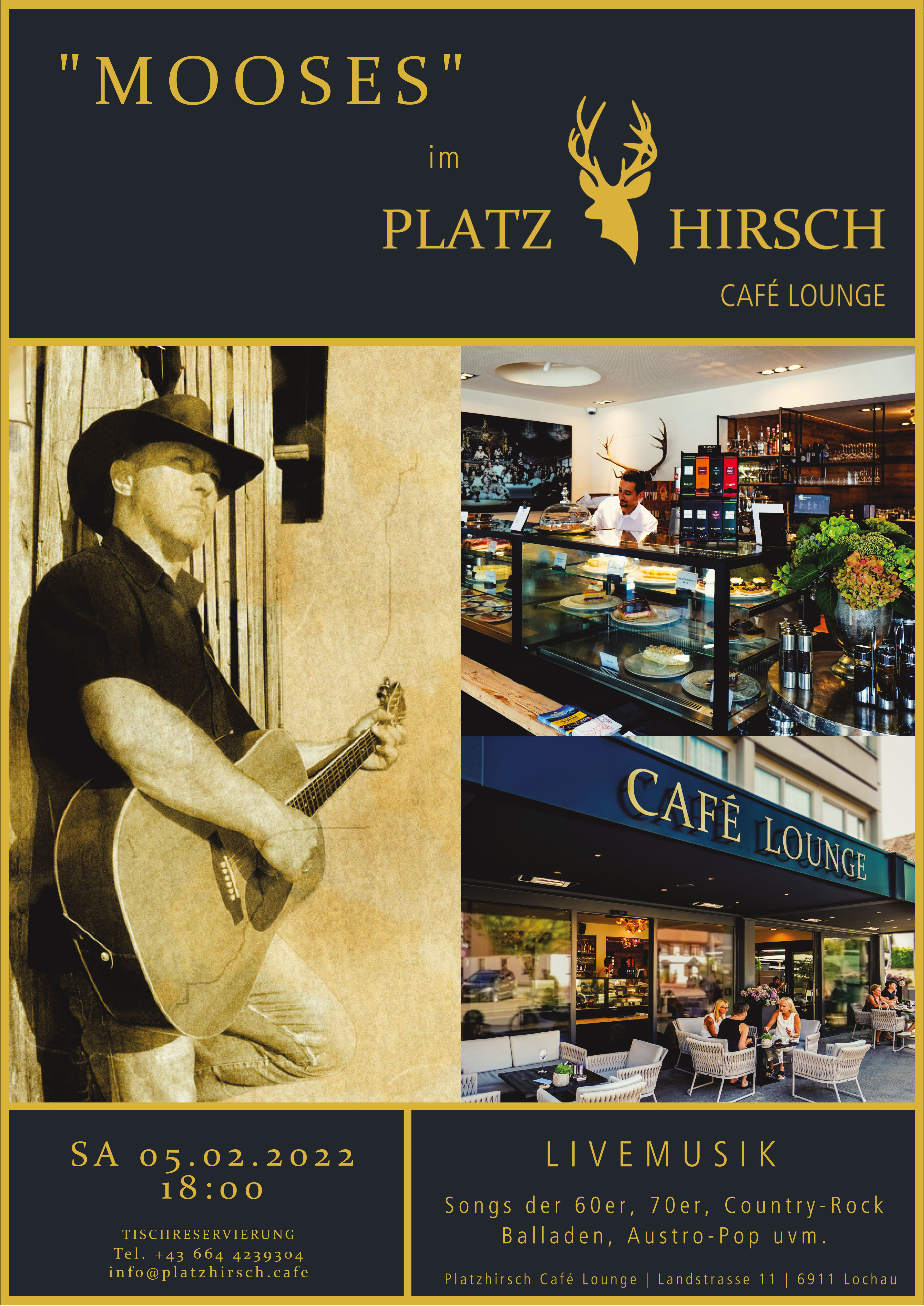 - Cafe Lounge Platzhirsch LochauLive Musik mit Mooses im Platzhirsch. Drinks, Essen, Musik und Mehr. € 5,00 Musikbeitrag pro Person. Reservationen möglich unter 0043 664 4239304 oder info@platzhirsch.cafe. Wir freuen uns auf Ihren Besuch.