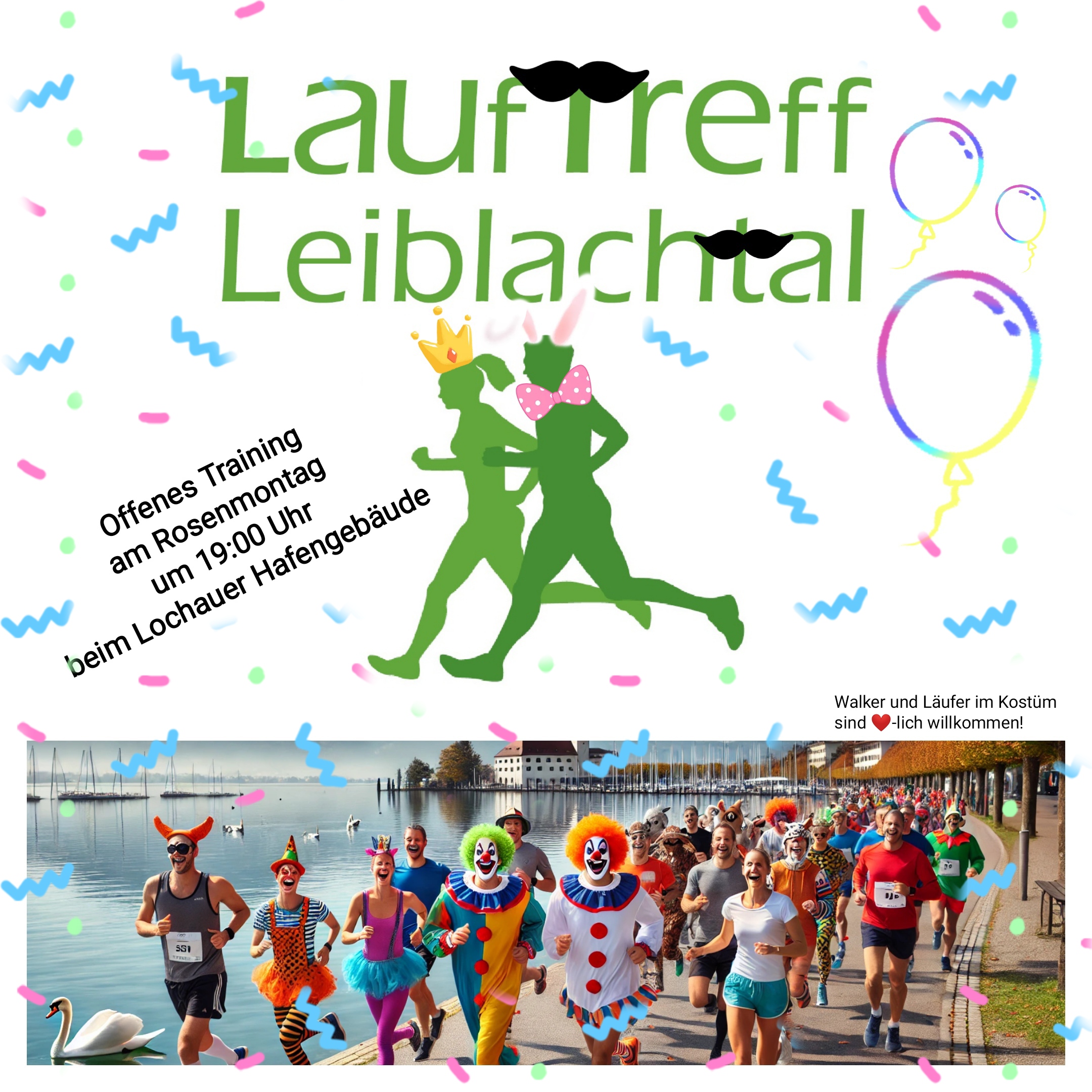 - Hafen Lochau / Alte FähreOffenes Lauftraining zum Faschingshöhepunkt mit gemeinsamen Ausklang. Wir freuen uns über viele verkleidete Läufer.
