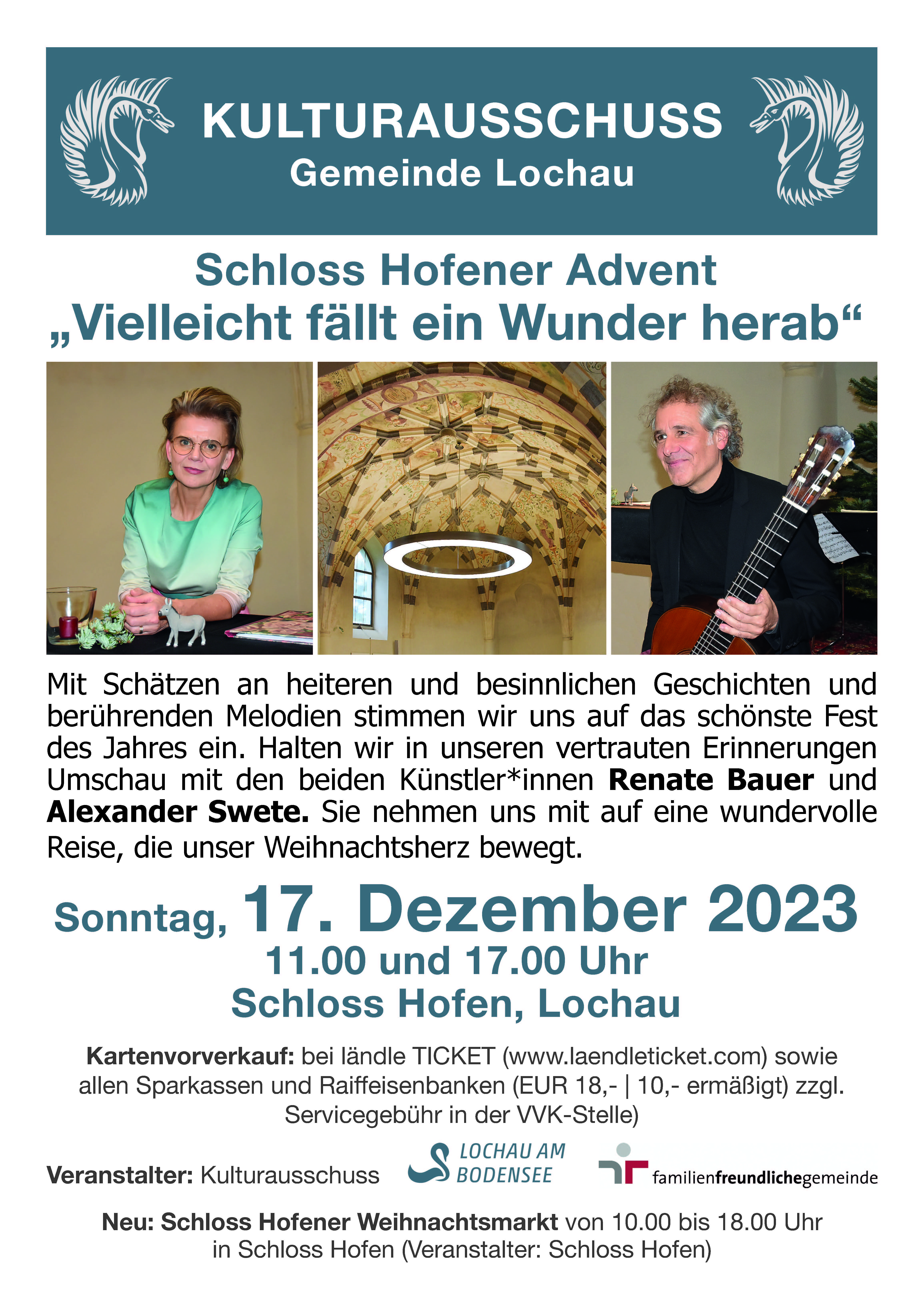 - Schloss HofenMit Schätzen an heiteren und besinnlichen Geschichten und berührenden Melodien stimmen wir uns auf das schönste Fest des Jahres ein. Halten wir in unseren vertrauten Erinnerungen Umschau mit den beiden Künstler*innen Renate Bauer und Alexander Swete. Sie nehmen uns mit auf eine wundervolle Reise, die unser Weihnachtsherz bewegt.