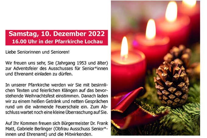 Wir freuen uns sehr, Sie (Jahrgang 1953 und älter) zur Adventsfeier des Ausschusses für Senior*innen und Ehrenamt einladen zu dürfen.
